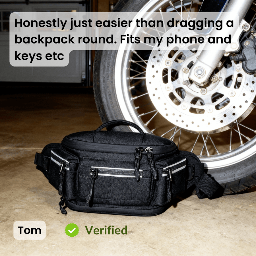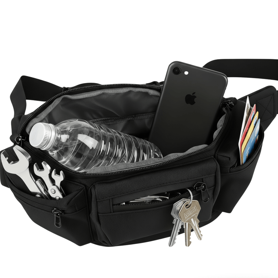 It’s designed for your essentials - phone, wallet, keys, and a couple of extras like gloves or a small bottle. Just enough without the bulk of a backpack.